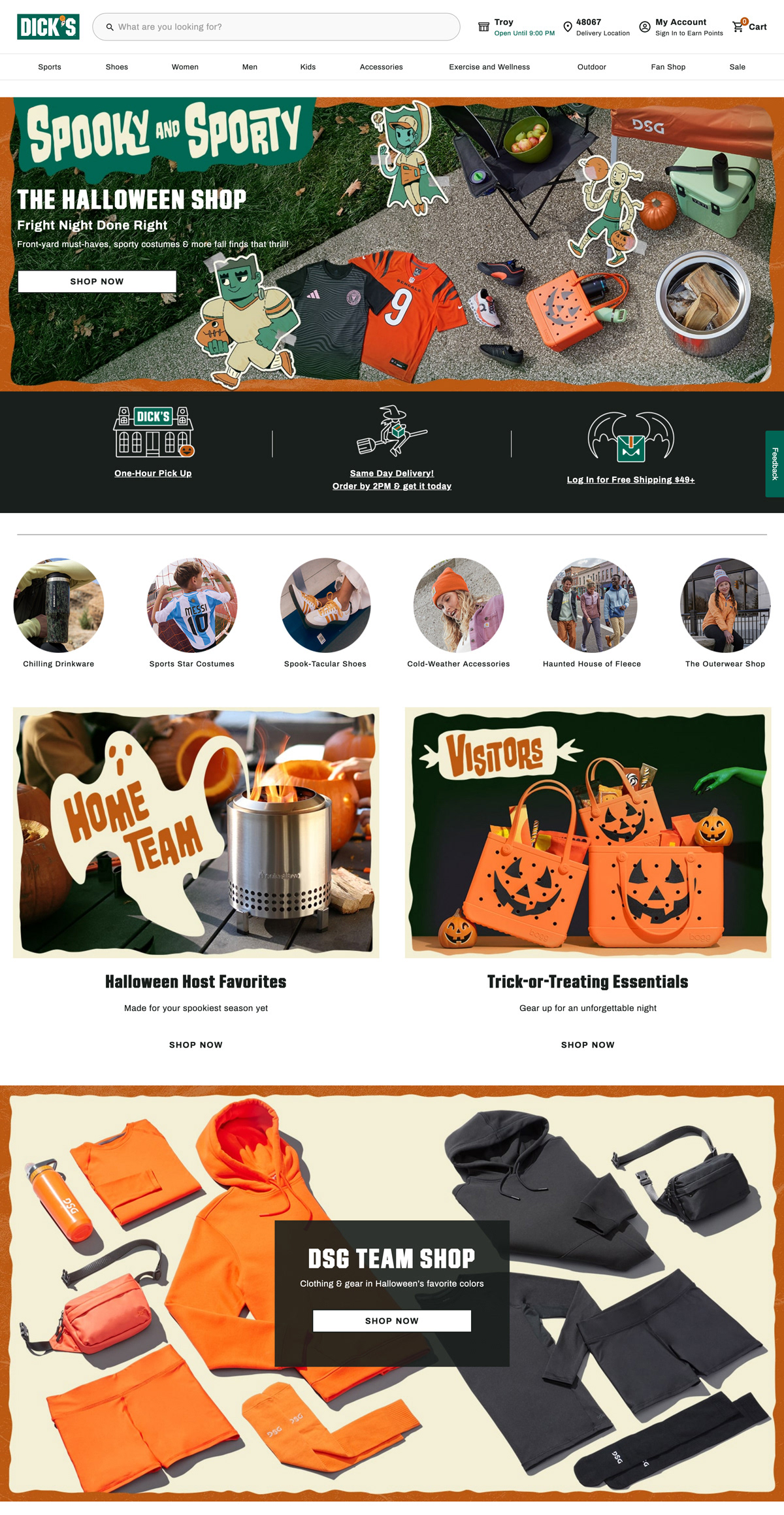 A seasonal shopping experience designed for Halloween, blending the worlds of sports and spooky. Custom illustrations, themed icons, and festive graphics brought the page to life—creating a fun, immersive crossover between Halloween and athletic fandom.